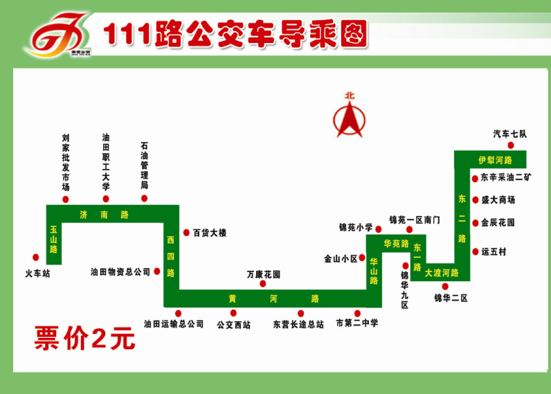 111路:該線路自汽車七隊始發(fā),經(jīng)伊犁河路(華瑞小區(qū))、東二路(盛大商場、運五村)、大渡河路(錦華五區(qū))、東一路(錦華九區(qū)),改經(jīng)華苑路(錦苑一區(qū)南門、錦苑小學(xué))、華山路(金山小區(qū)),到達黃河路后,恢復(fù)原線路,單程里程24.3公里,票價、班次均不變。