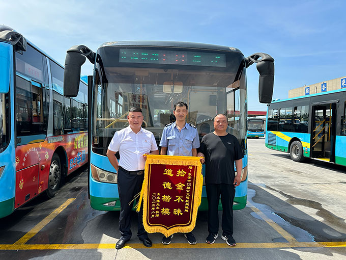 8月1日,陳先生將一面寫有“拾金不昧,道德楷?!钡腻\旗送到市公交集團汽車六隊,感謝131路駕駛員周鵬鵬師傅拾金不昧。