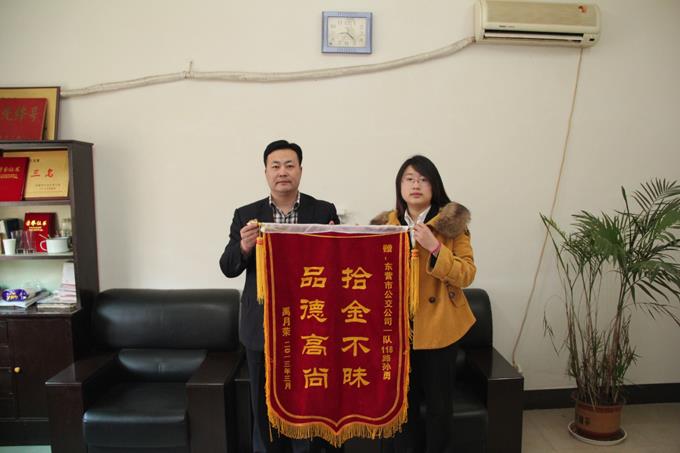 4月9日上午,康源律師事務(wù)所的禹月榮女士拿著一面寫有“拾金不昧、品德高尚”的錦旗來到市公交公司汽車一隊,感謝車隊駕駛員孫勇師傅的高尚品德。據(jù)車隊了解得知,4月4日,禹月榮女士乘坐孫勇師傅駕駛的118路去上班,上班以后發(fā)現(xiàn)裝有重要文件的拎包不見了,她心急如焚,當時就癱坐在地上,因為包里面裝有五個檔案袋,卷中裝有重要的訴訟材料,其中很多資料無法彌補,后果不堪設(shè)想。