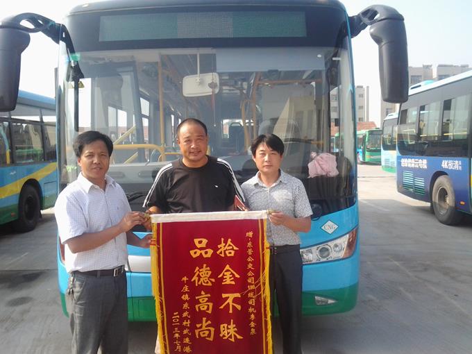 2013年7月29日,東營(yíng)區(qū)牛莊鎮(zhèn)東武村的武連港師傅為公交車駕駛員李金泉送來了一面“拾金不昧、品德高尚”的錦旗表示感謝。