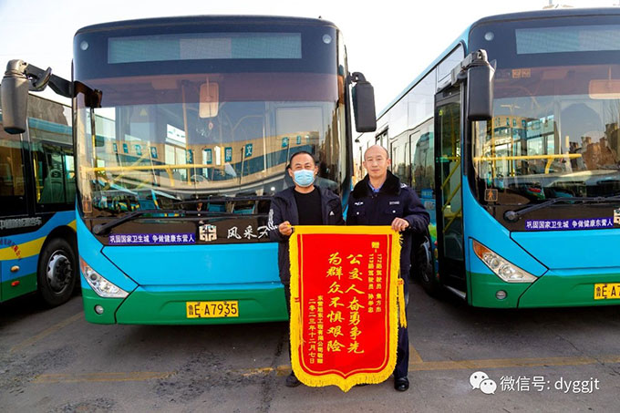 2023年12月8日,東營旭東工程公司的代表來到東營公交集團(tuán)汽車七隊(duì)贈送一面錦旗,上面寫著“公交人奮勇爭先,為群眾不懼艱險(xiǎn)”的字樣。這時大家才知道,原來是兩位公交駕駛員見義勇為幫助他們滅了一輛正在自燃的小貨車。