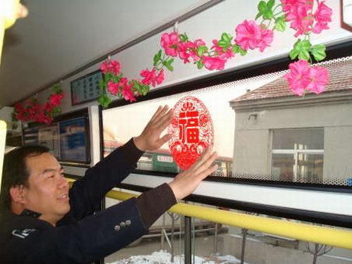 元月11日春運(yùn)第一天,公交公司8路車組工作人員忙著將自費(fèi)購(gòu)買的彩色拉花、剪紙等飾品,張貼、懸掛在車廂內(nèi),積極營(yíng)造出春運(yùn)溫馨和諧的喜慶氣氛,與乘客一起喜迎春節(jié)的到來。