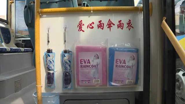 在東營市公交公司汽車三隊(duì)停車場(chǎng),駕駛員李斌像往常一樣,把自己駕駛的38路公交車仔仔細(xì)細(xì)打掃了一遍。記者在他的車上,還看到了一些特別的便民物品:前排的礦泉水、藥箱,后排的便民雨傘、雨衣。李斌告訴記者,這些都是他自己購置安裝的,就是為了方便乘客。